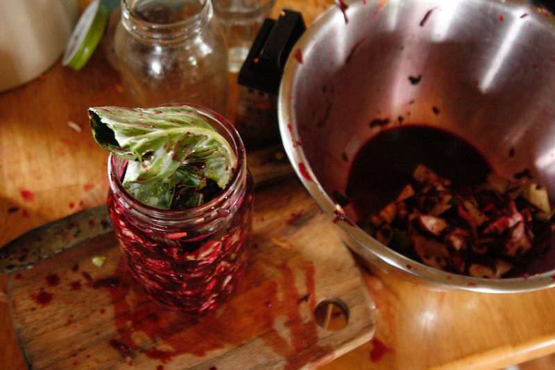 5. To keep everything safely submerged under the brine, Andrew folds an outer cabbage leaf into a square and tucks it down on top of the rest to help keep it all from bobbing above liquid level. The liquid should cover everything. If you don’t have enough because, say you used an older, drying-out cabbage, then just make a bit of brine to make up the difference.